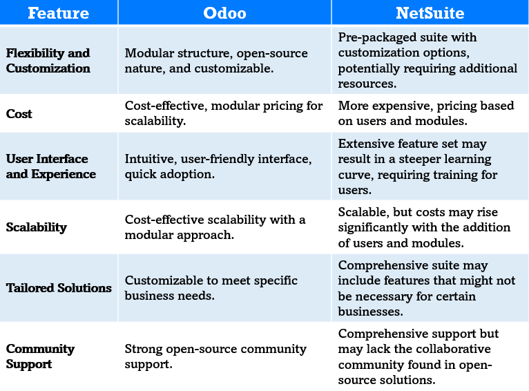 While NetSuite undoubtedly offers a comprehensive suite of applications and is well-suited for certain mid-sized to large enterprises, the flexibility, cost-effectiveness, and community-driven innovation of Odoo make it the superior choice for businesses looking to optimize their ERP experience. In the competitive landscape of business management software, Odoo stands tall, providing a solution that evolves with your business and empowers you to shape the future of your operations.