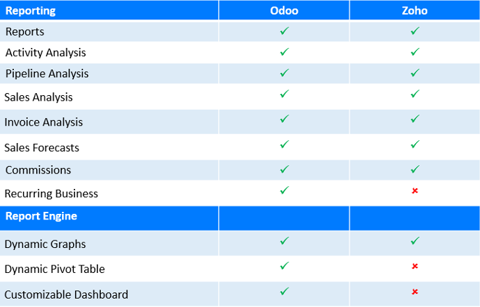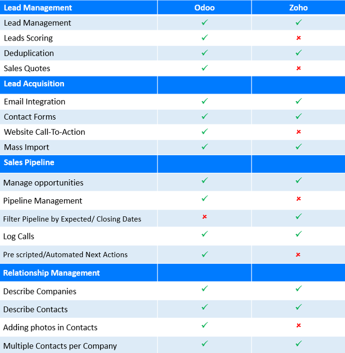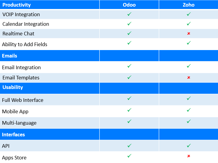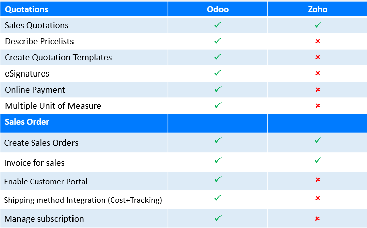 The following illustrates a comparison between Odoo and Zoho across various domains.