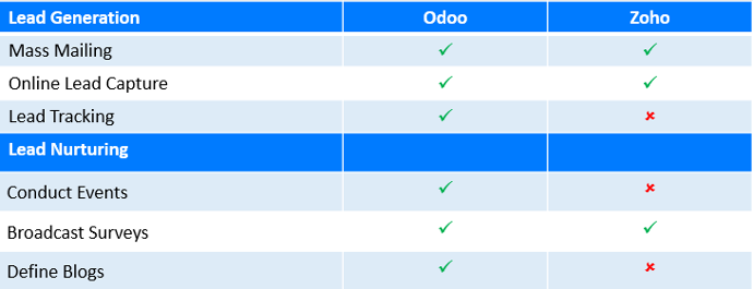 In the marketing arena, Odoo Enterprise stands tall with its robust suite, including mass mailing, online lead capture, and dynamic event management. While Zoho offers solid marketing features, Odoo's comprehensive toolkit, combined with its seamless integration across modules, positions it as the prime choice for businesses seeking an all-encompassing and highly customizable marketing solution.